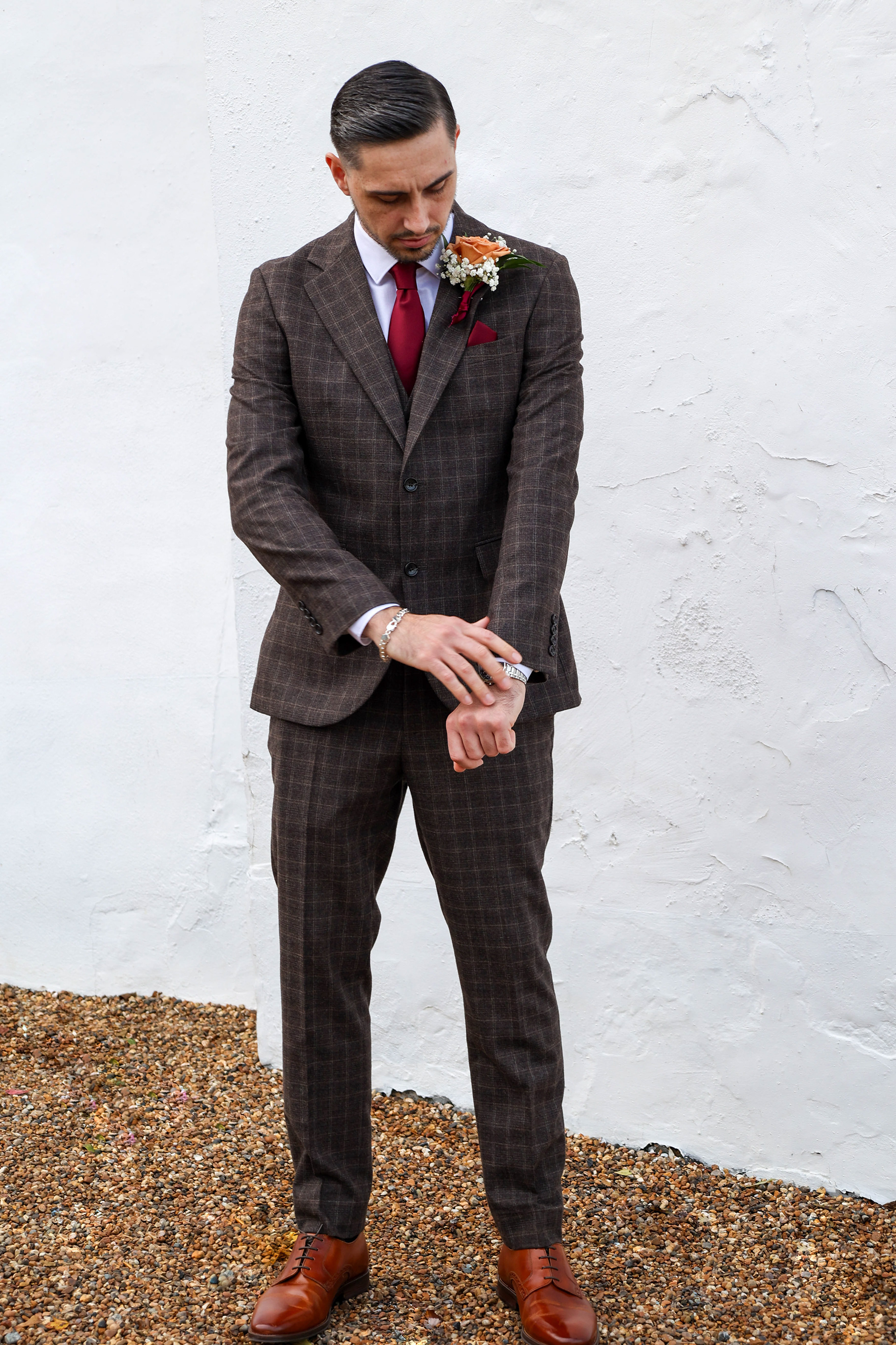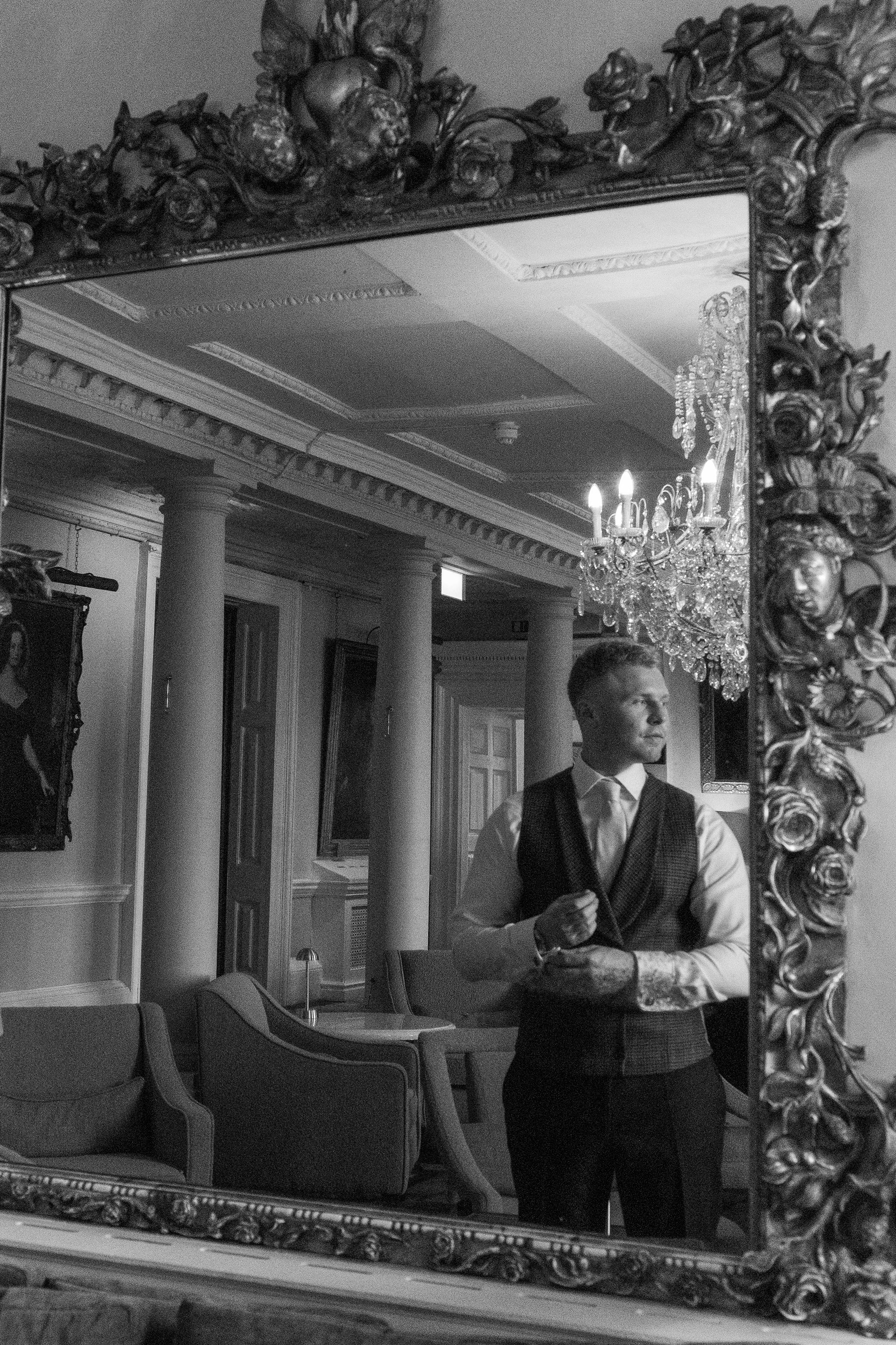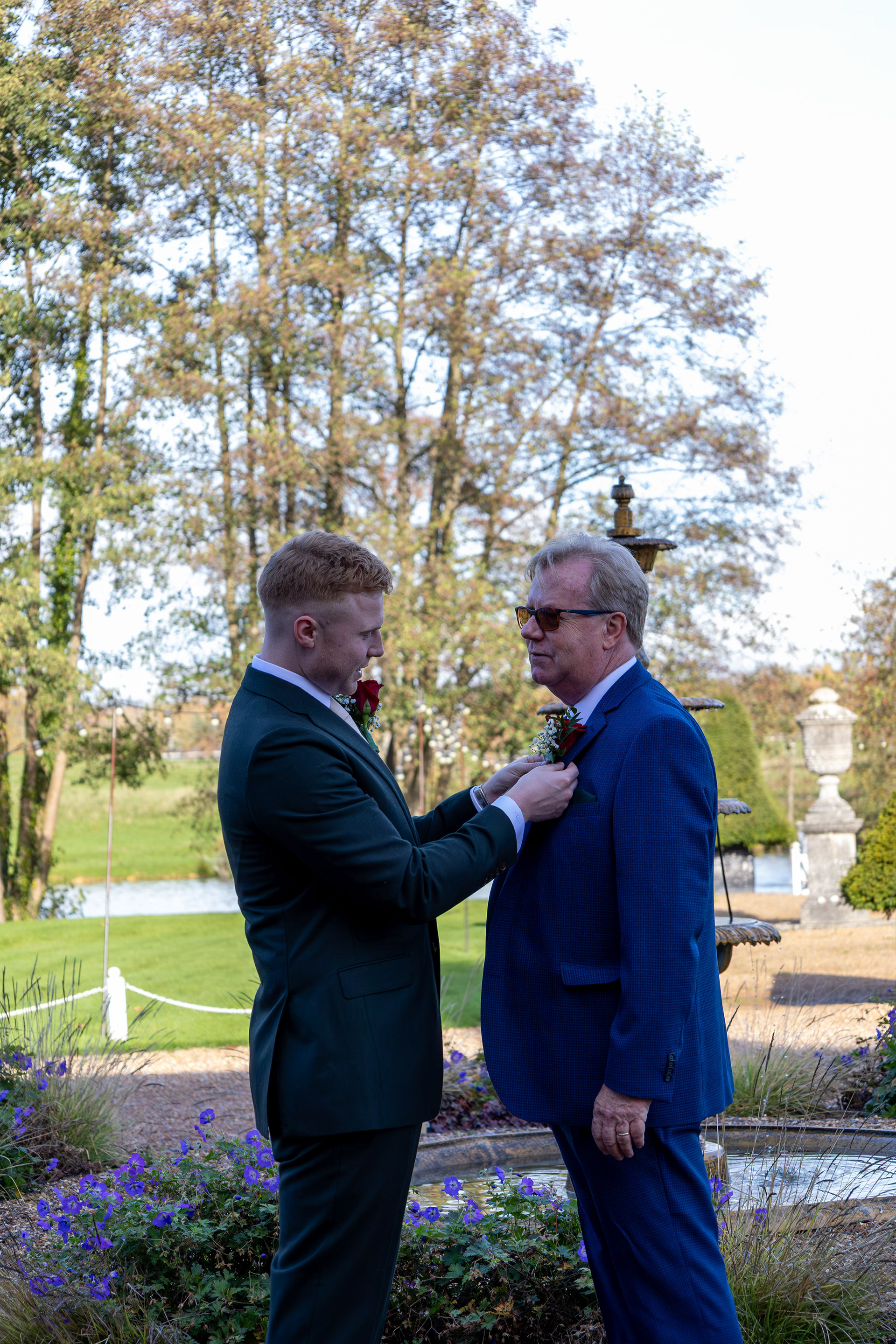 A best man’s final touch: Adjusting the groom’s boutonnière for a picture-perfect wedding moment.