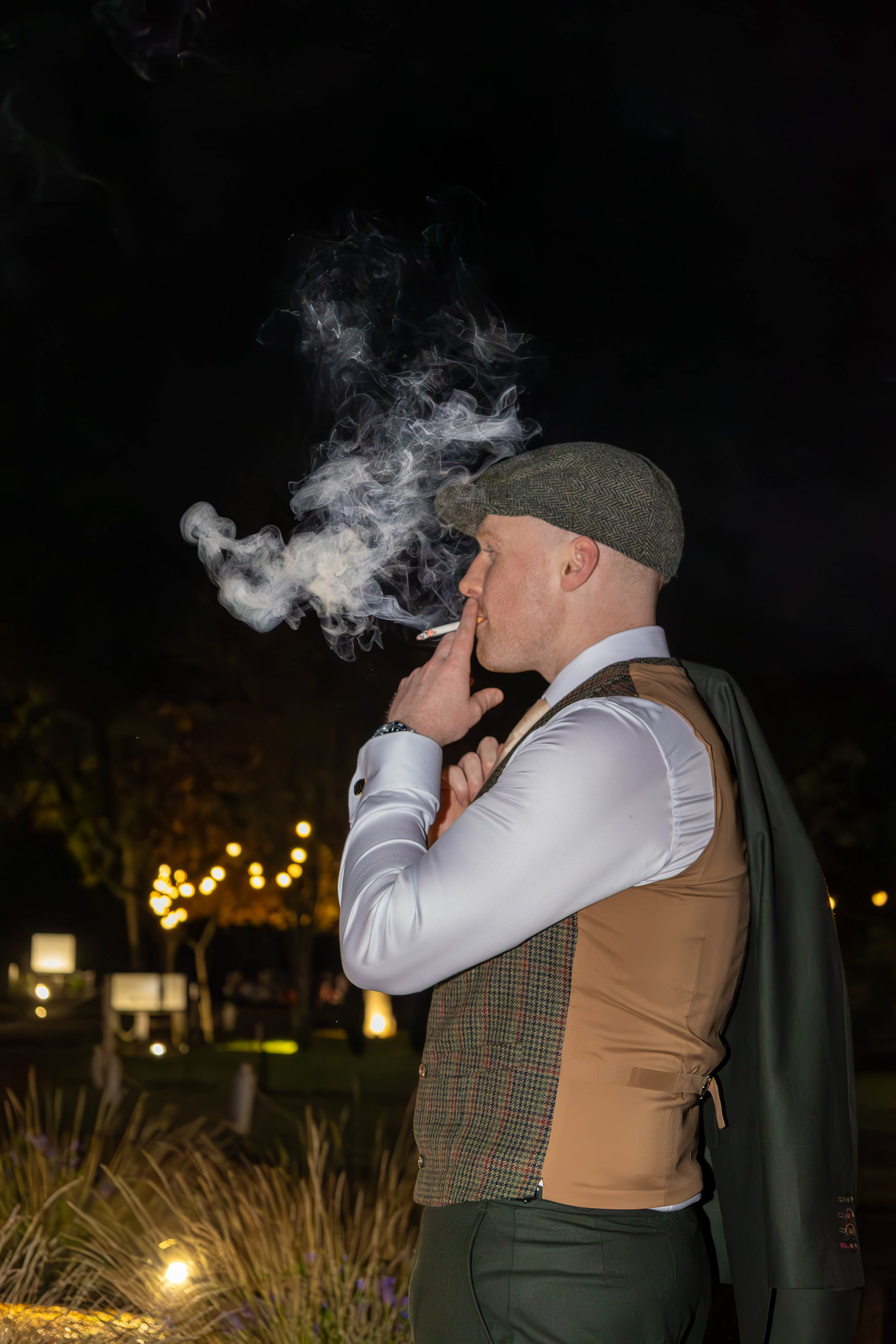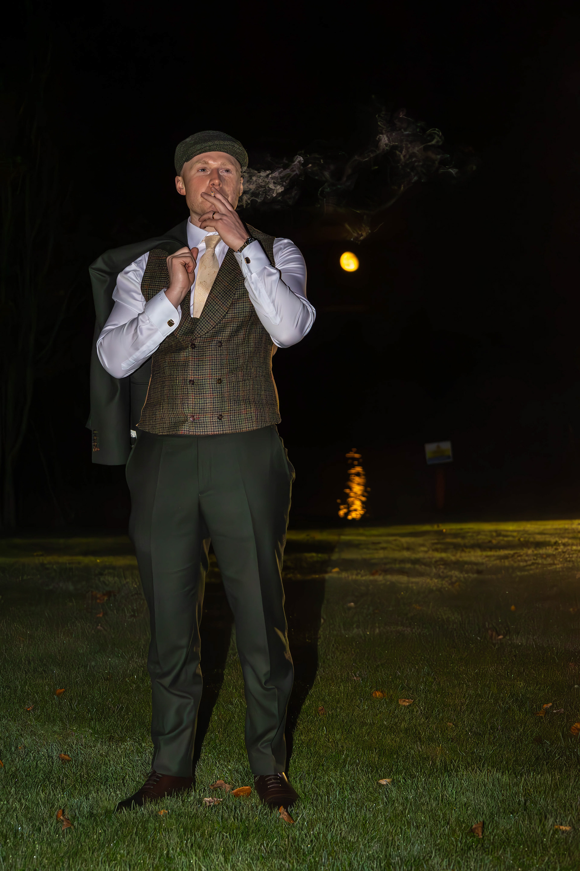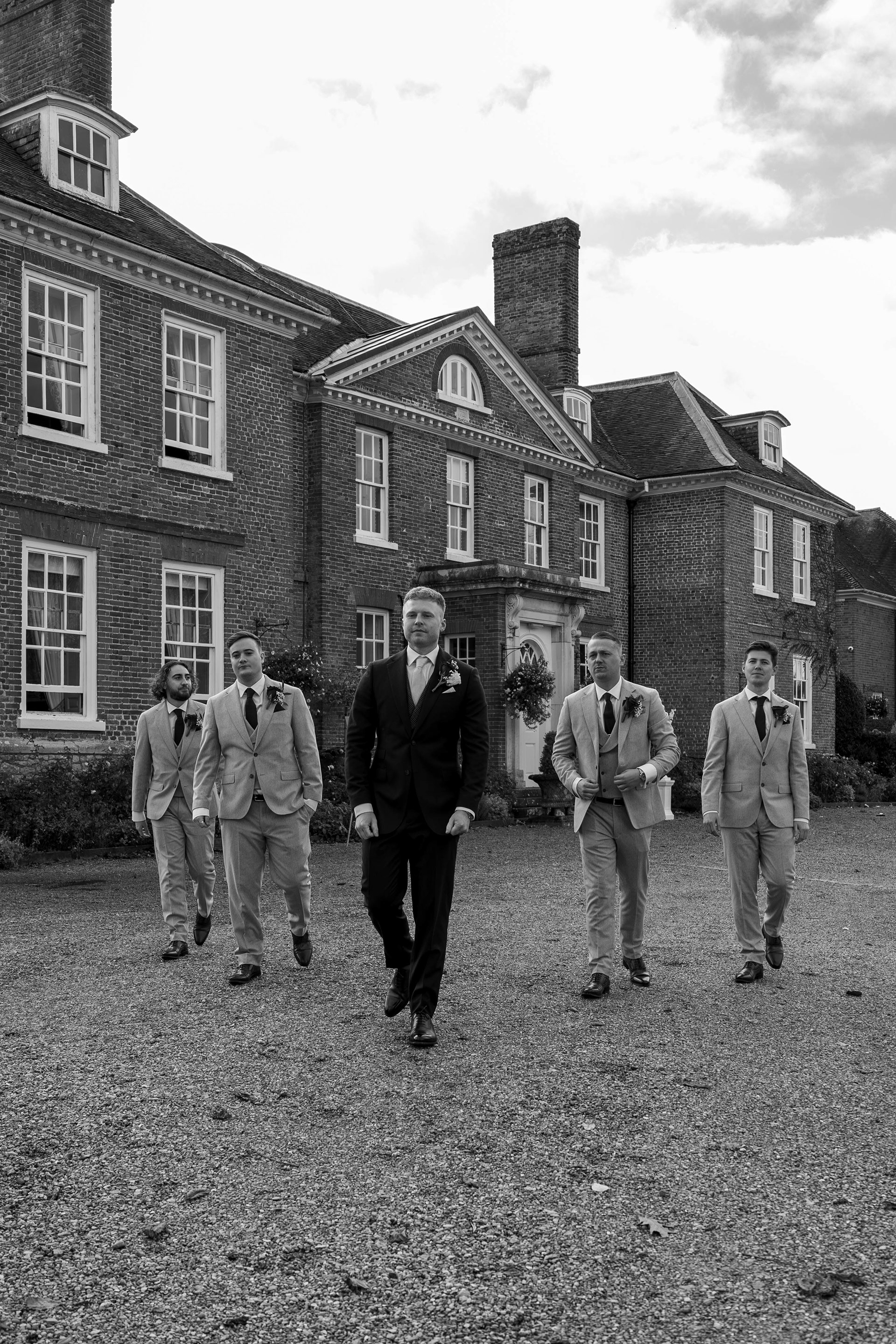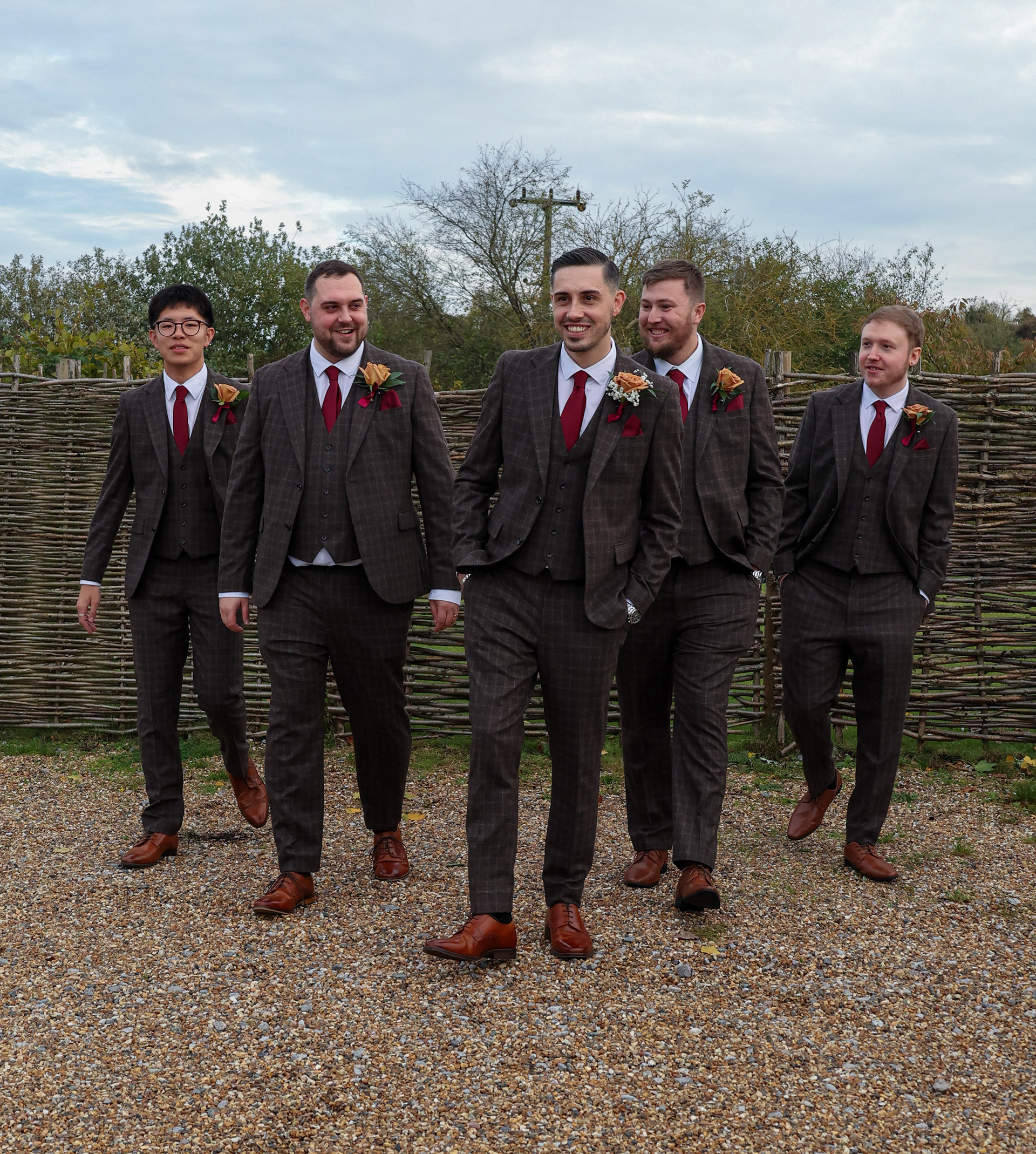 A best man’s final touch: Adjusting the groom’s boutonnière for a picture-perfect wedding moment.