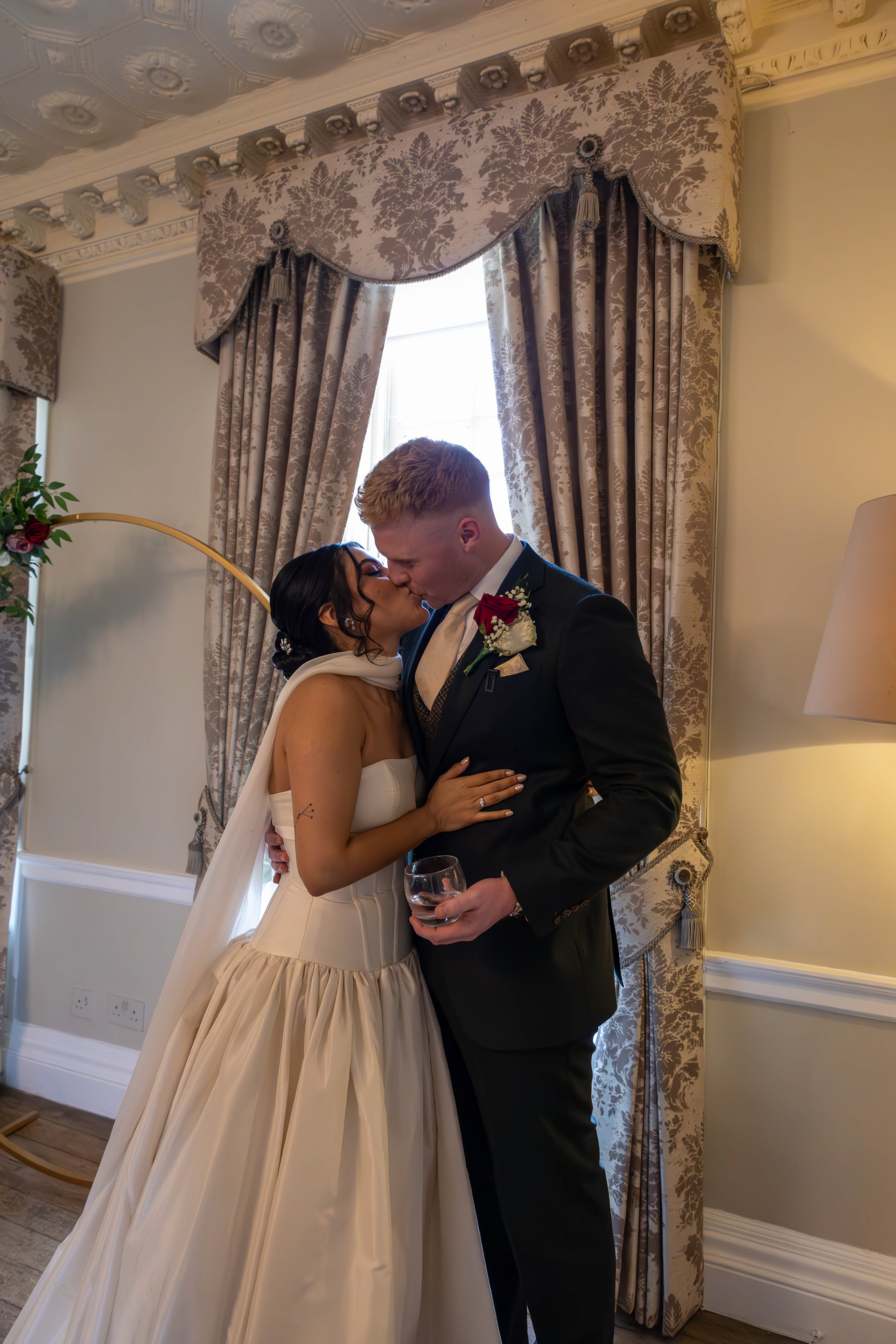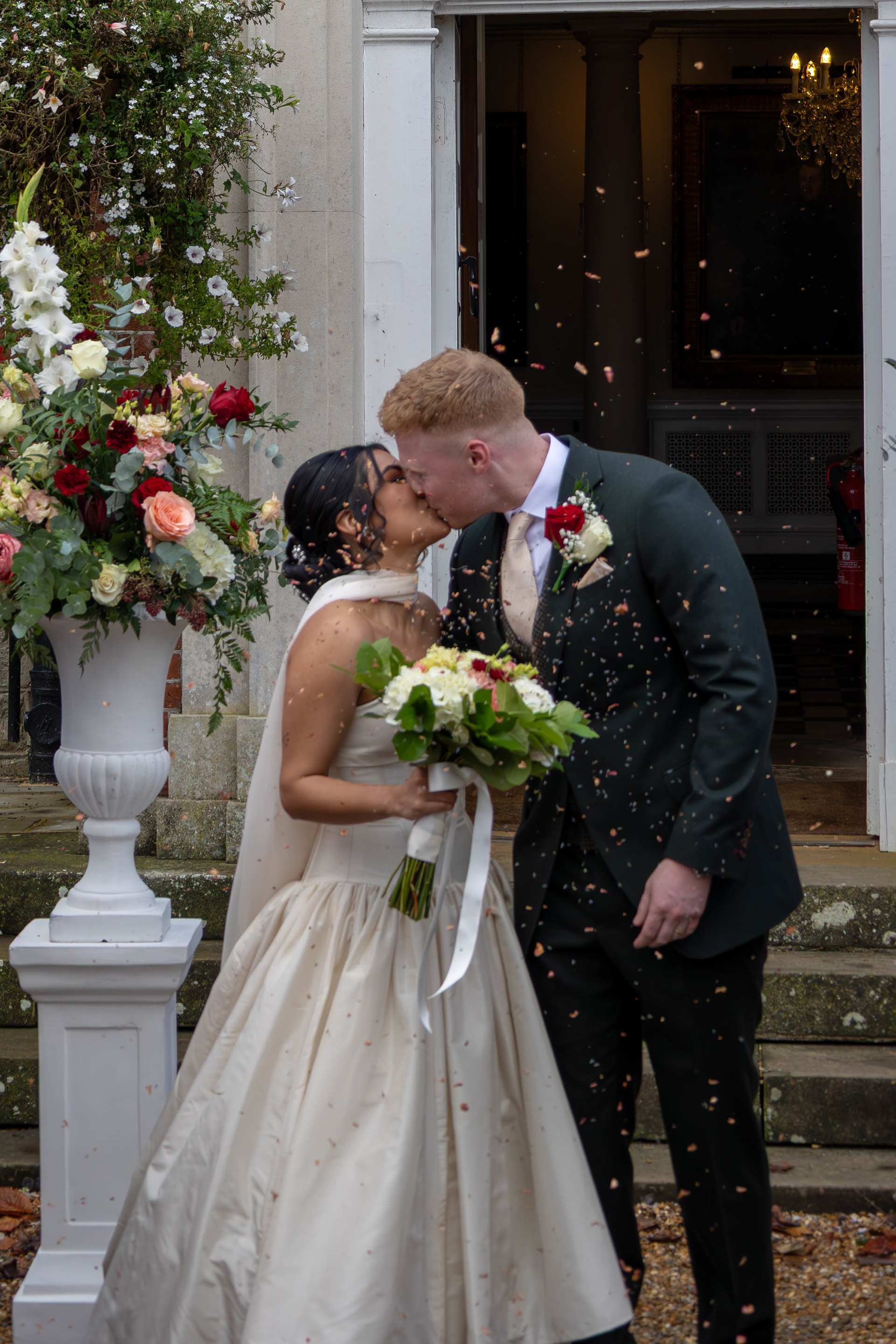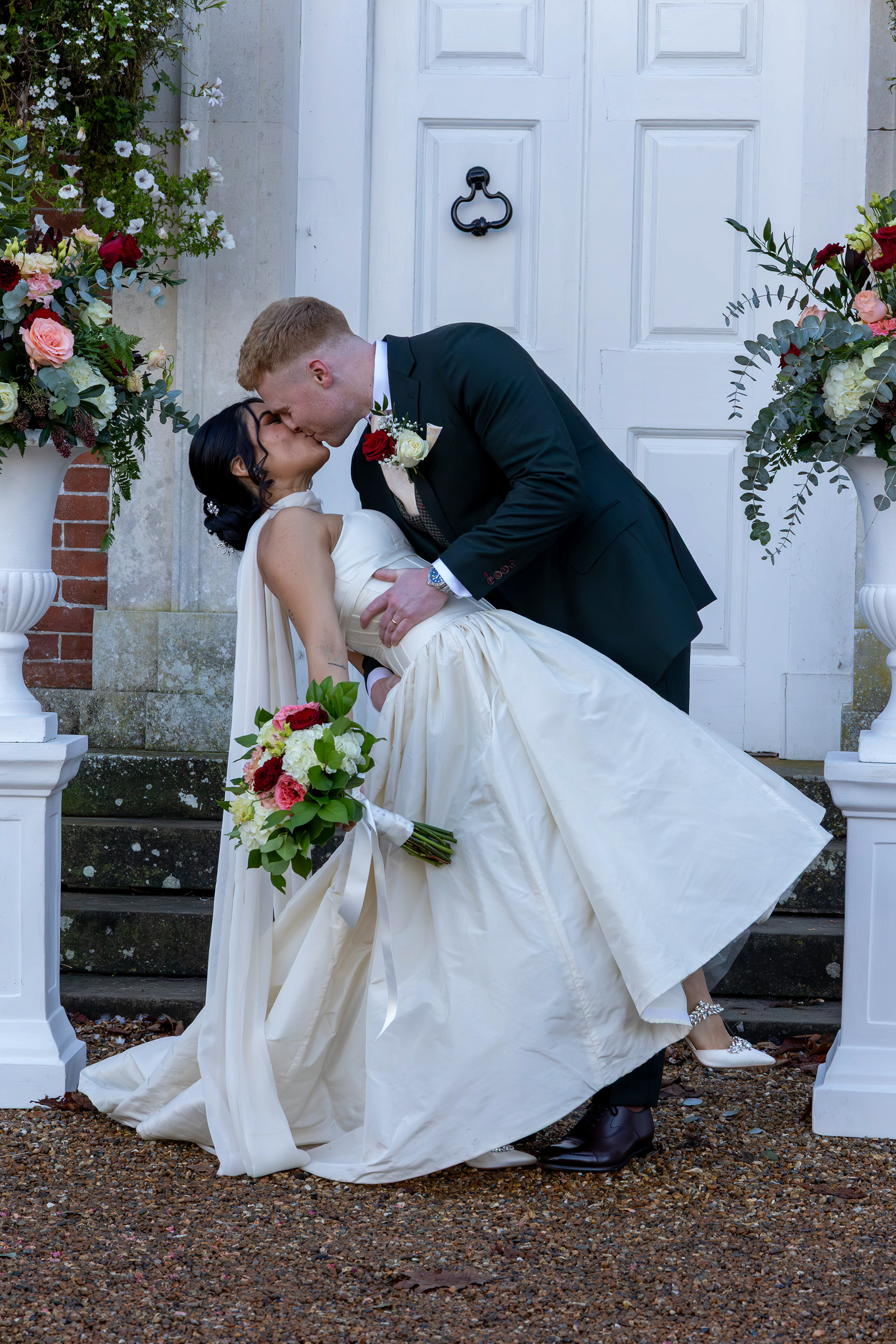 Newlyweds share a sunlit embrace beneath a floral wedding arch in Canterbury, Kent.