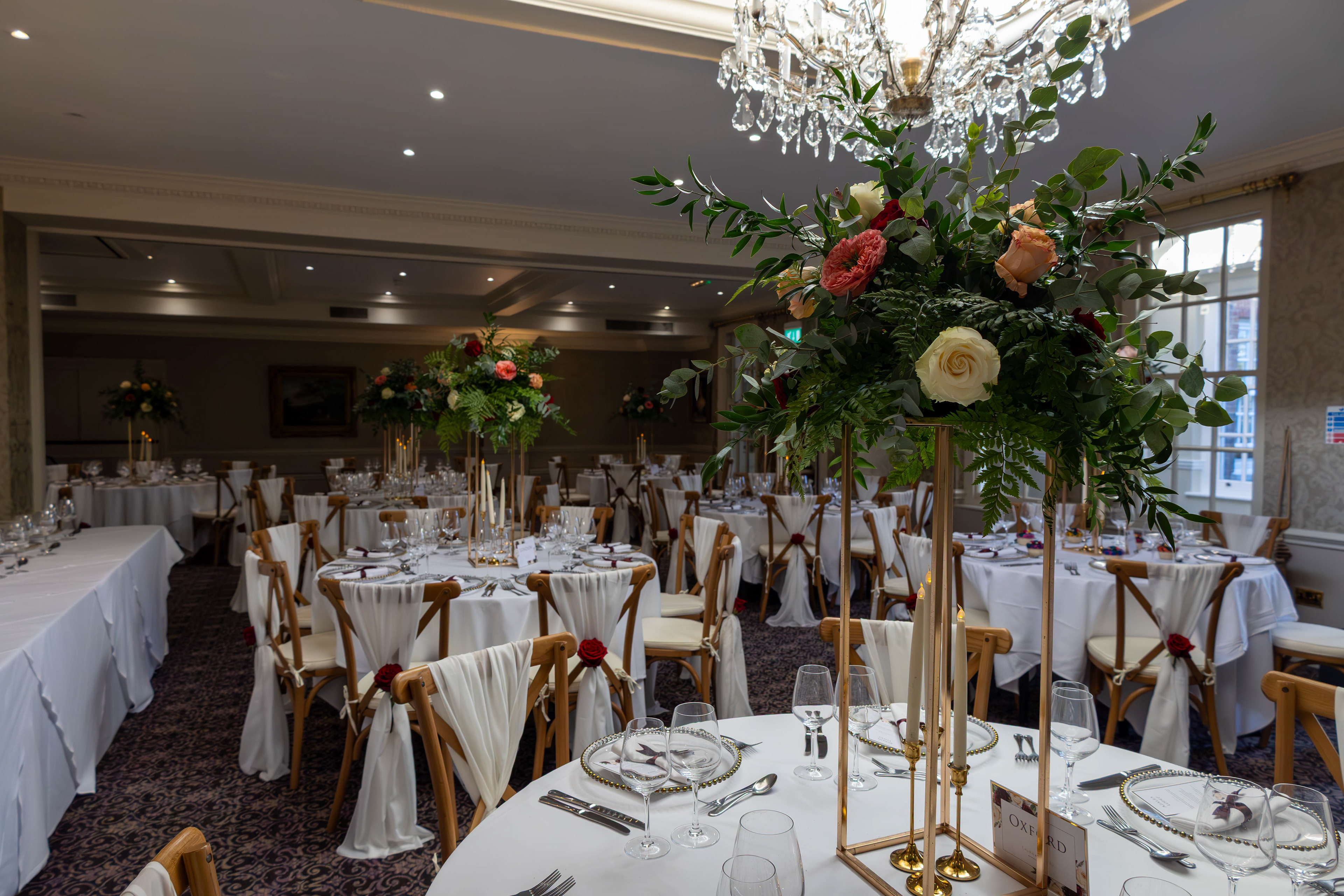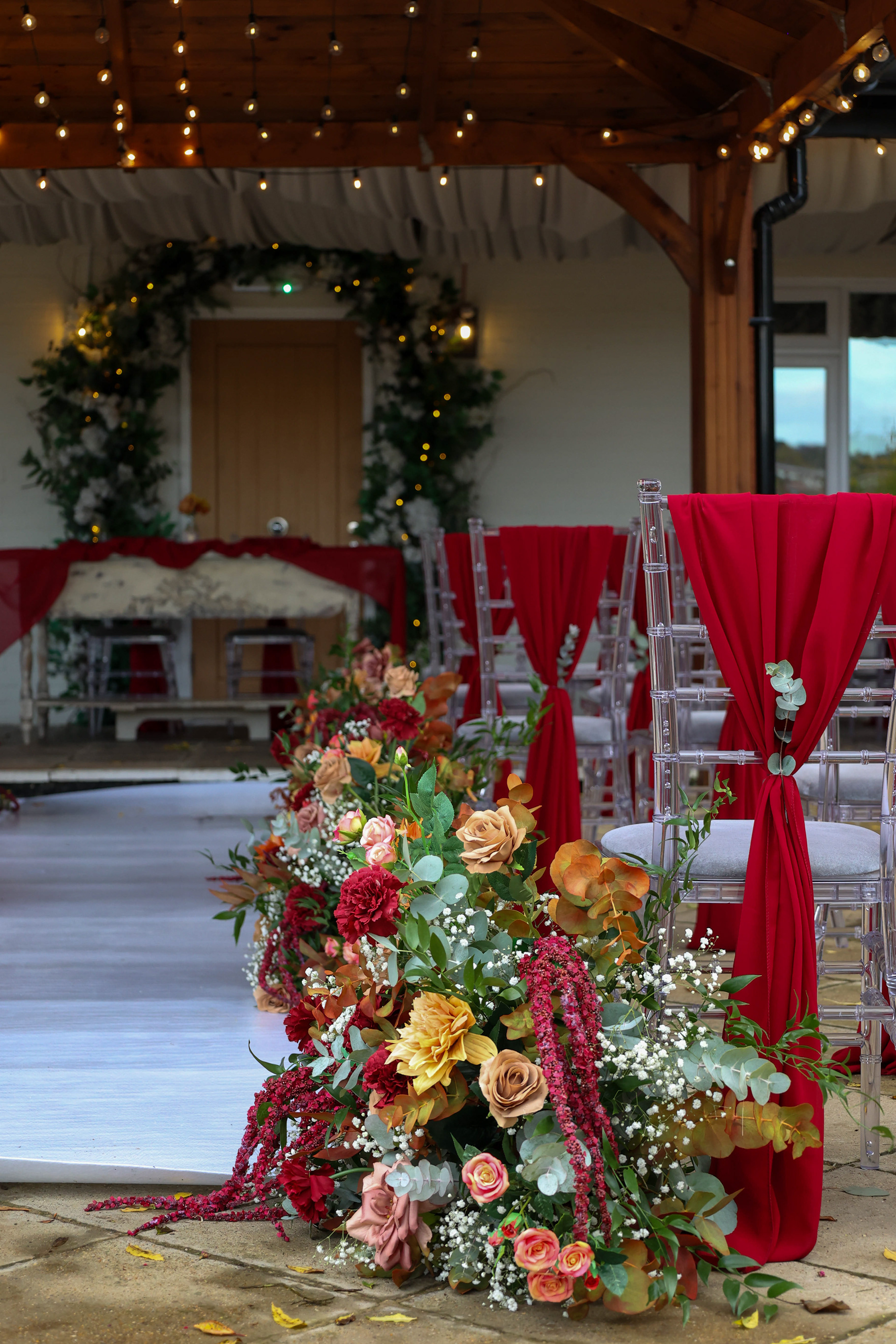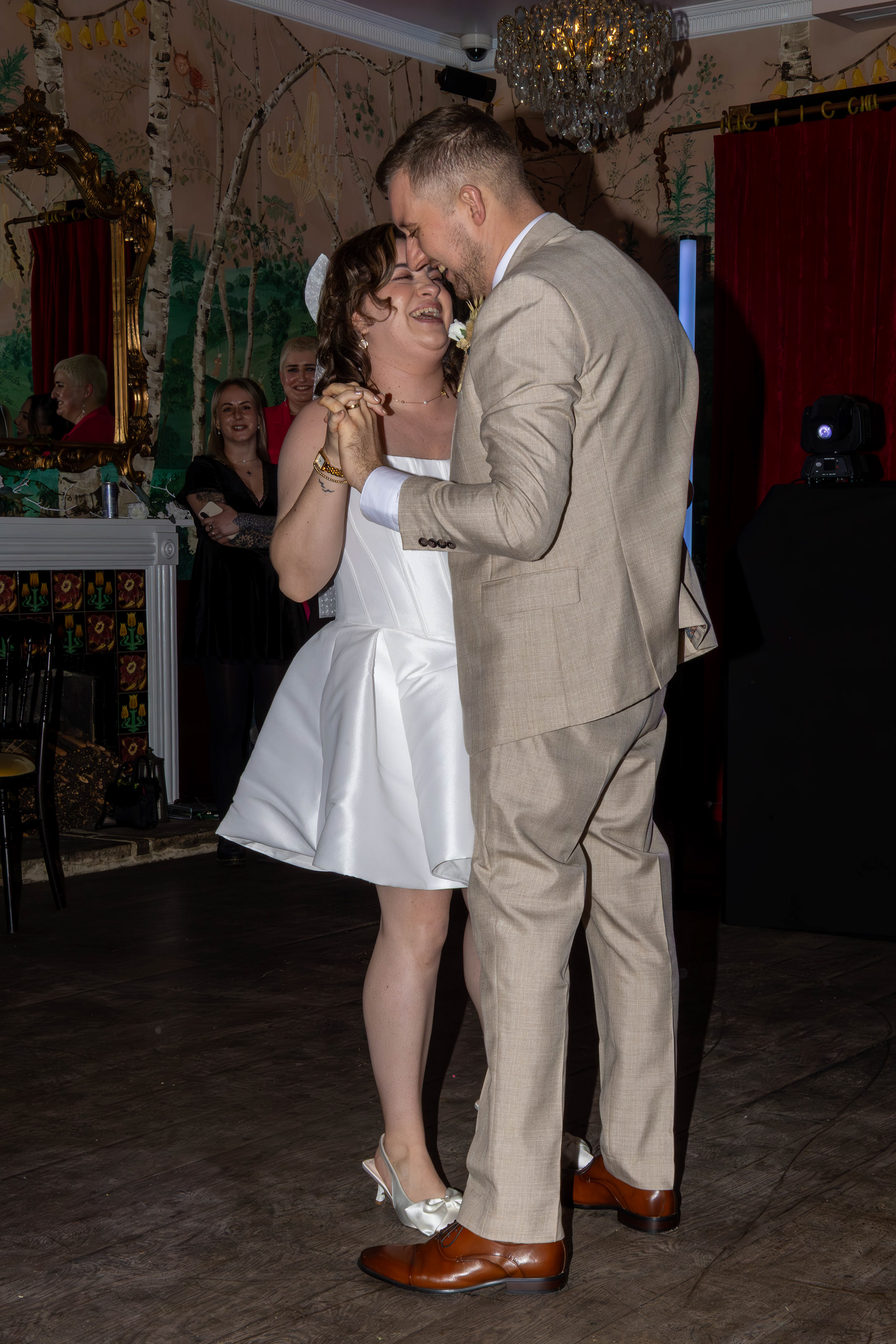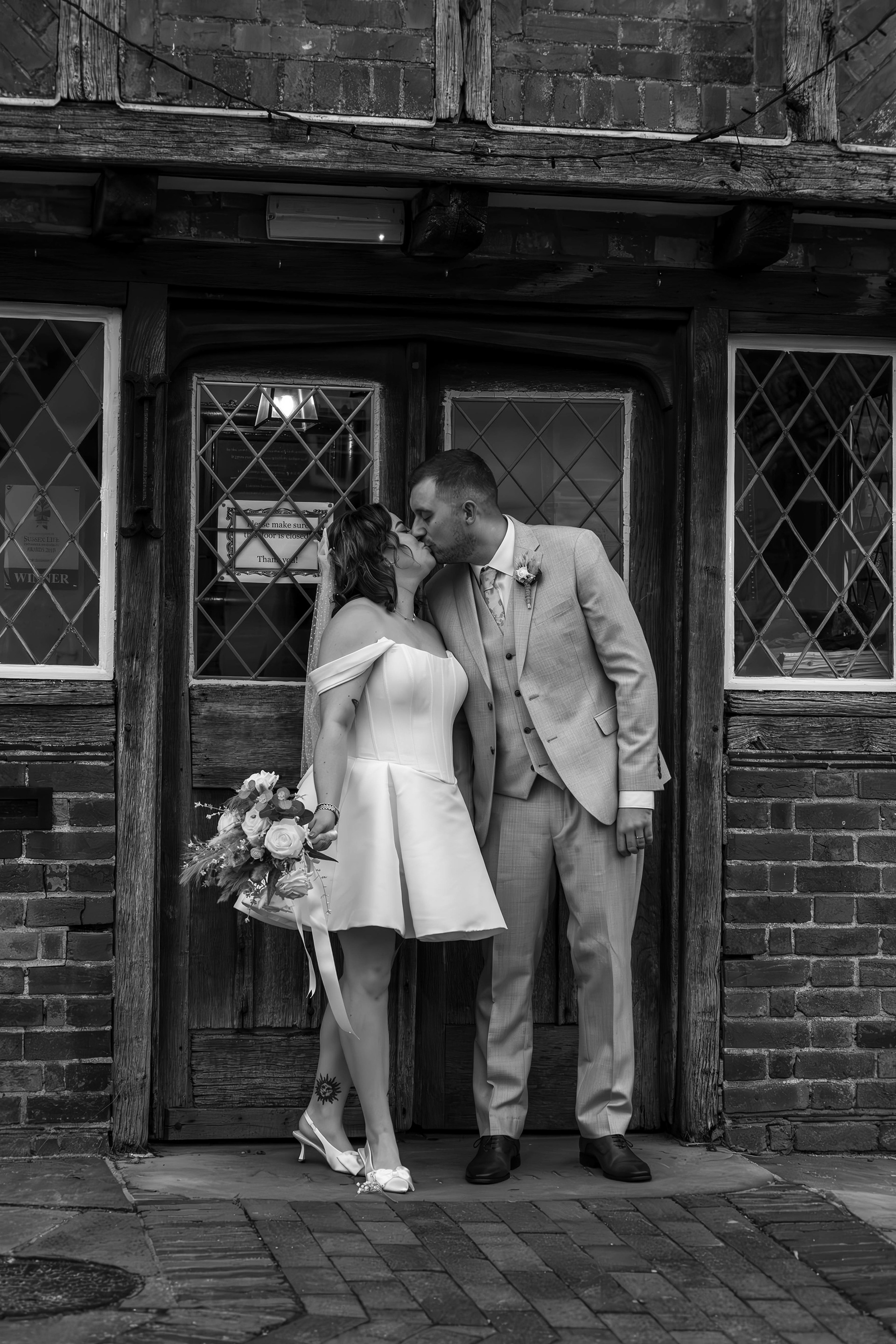 Newlyweds share a sunlit embrace beneath a floral wedding arch in Canterbury, Kent.