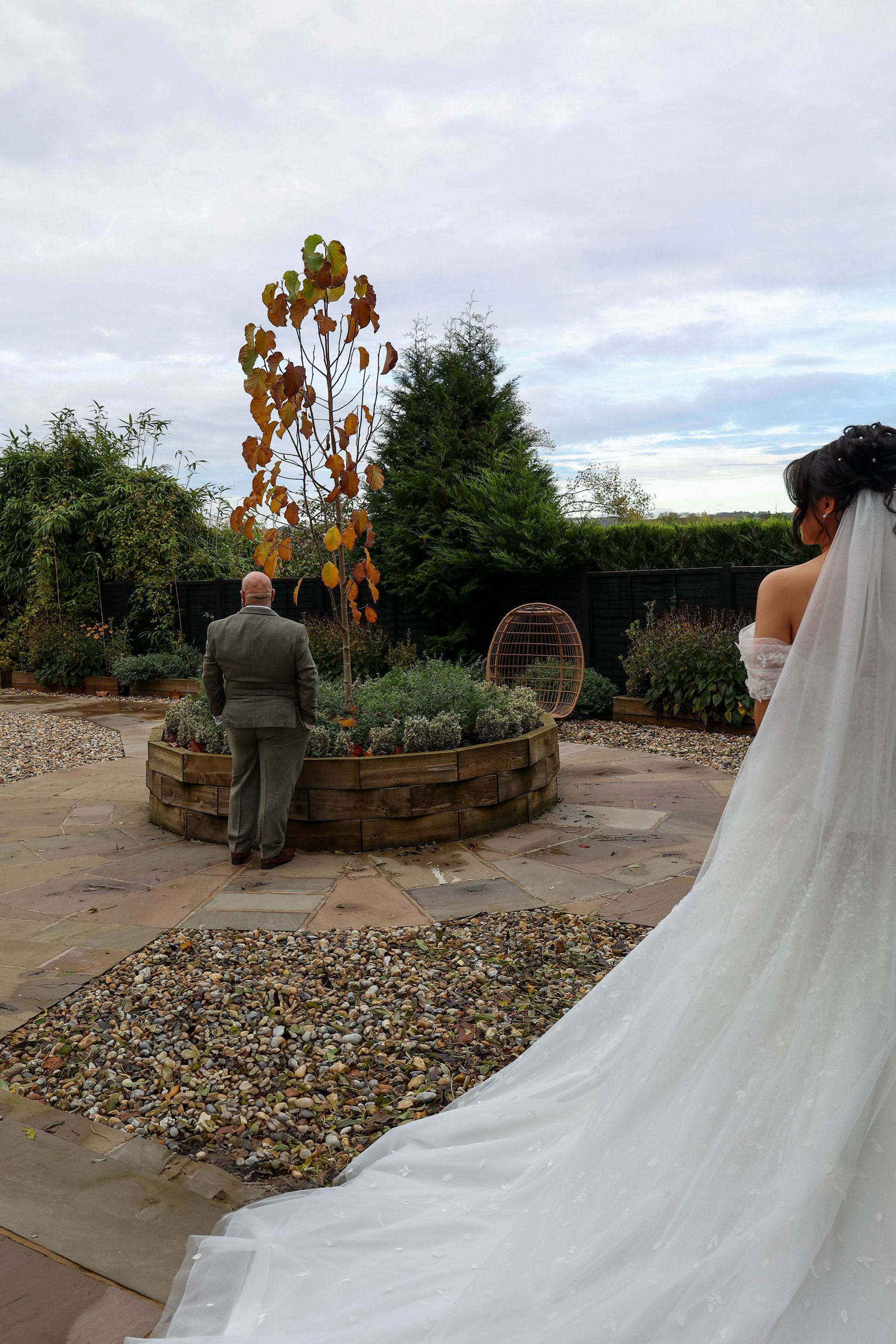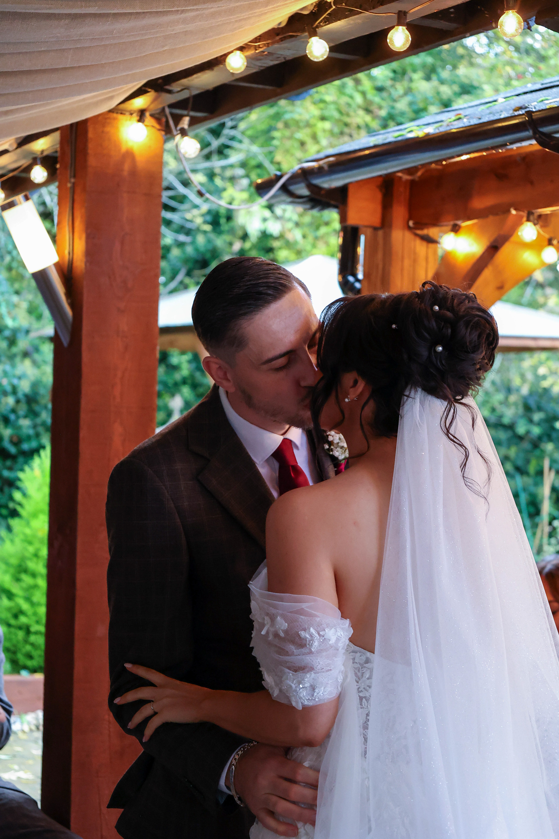 Couple enjoys a serene moment in the lush garden of a Canterbury wedding venue in Kent.